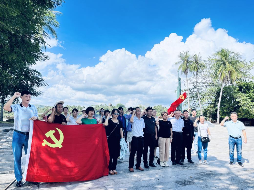 到达琼海叶子寨战斗遗址已是正午,党员同志们顶着烈日,热情不减。1927年9月23日,椰子寨战斗打响了琼崖武装革命的第一枪,成为琼崖人民军队诞生和武装斗争红旗树立的标志。从此,琼崖人民在中国共产党坚强有力的领导下,开启了孤岛奋战,艰苦卓绝,23年红旗不倒的光辉历程。在椰子寨战斗纪念广场主题雕塑前,全体党员庄严肃立,紧握右拳,重温入党誓词。