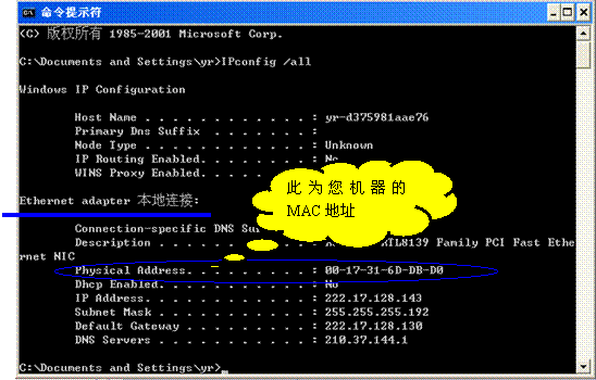 图中第三行就是您机器的MAC地址,即您网卡的世界唯一“身份证号”。
