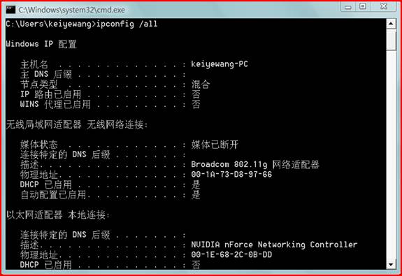 图中所列的“以太网适配器 本地连接”项目中的“物理地址”就是您的计算机的网卡的MAC地址(上图中的信息会因您机器的WINDOWS版本不同而不同,此图为vista系统显示,在XP系统中会是英文信息,请注意。)