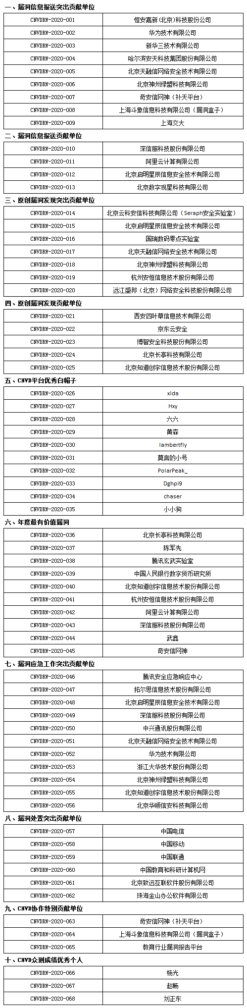会议总结了CNVD平台在2020年的工作情况,并对40家CNVD优秀成员单位和行业单位,以及10名优秀白帽子进行了表彰(名单附后)。此外,来自绿盟科技、数字观星、深信服、腾讯玄武、远江盛邦、杭州安恒和启明星辰的网络安全企业专家从漏洞防御、验证代码规范、攻击威胁感知、漏洞挖掘、防护安全、浏览器安全、工业机器人安全等角度分享了技术报告与观点。